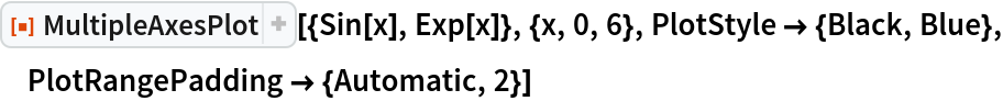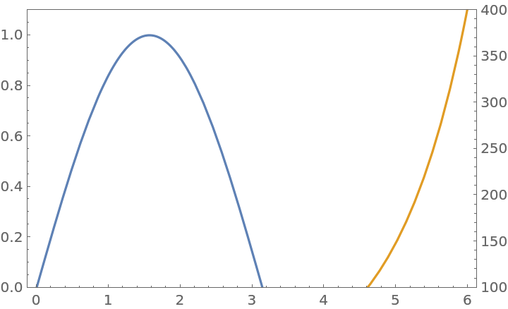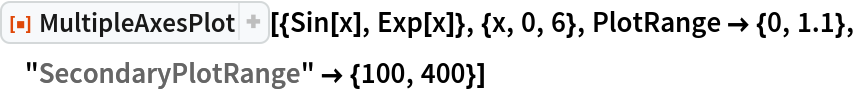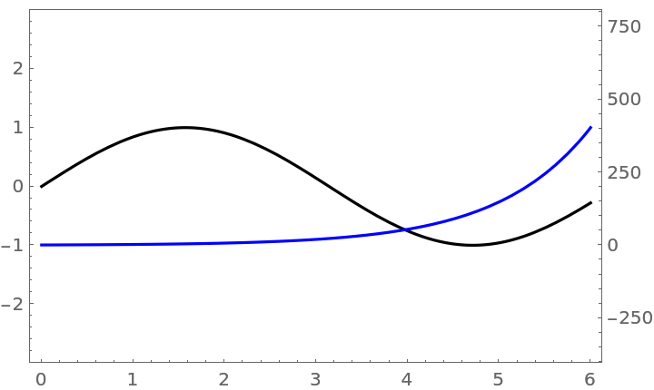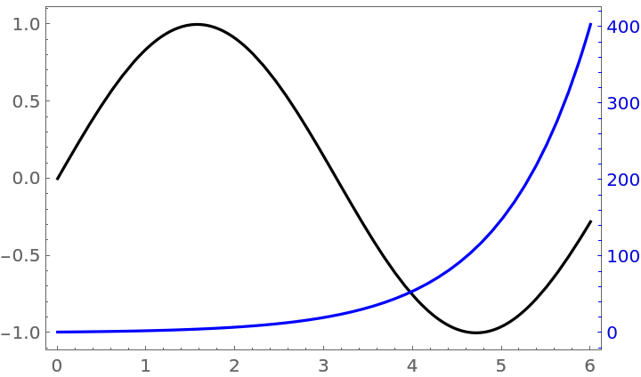 ResourceFunction["MultipleAxesPlot"][{expr1,expr2},{x,xmin,xmax}] generates a plot of expr1 and expr2 with two y-axes. |