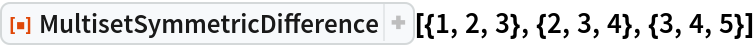 ResourceFunction["MultisetSymmetricDifference"][L1,L2,…] gives the list of elements that occur an odd number of times in the lists L1,L2,…. |
