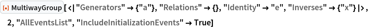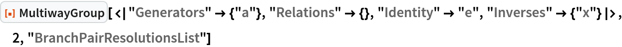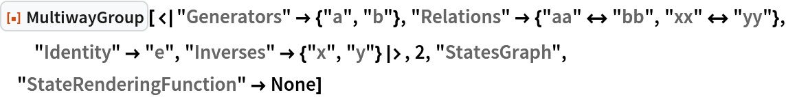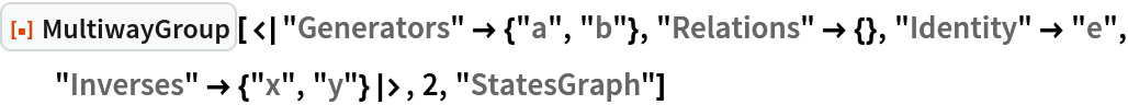 ResourceFunction["MultiwayGroup"][gen,…] specifies the free group with generators gen, default identity element "e" and default inverse elements "1","2",…. | |