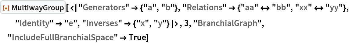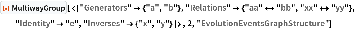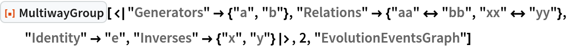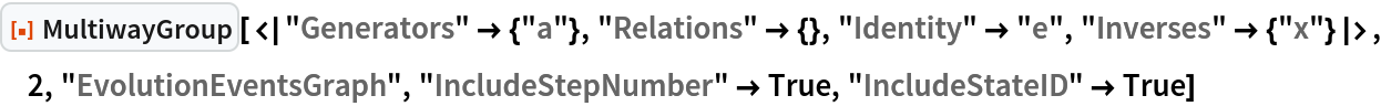ResourceFunction["MultiwayGroup"][<|"Generators"→gen,"Relations"→rel,"Identity"→id,"Inverses"→inv|>→sel,…] uses the function sel to select which of the events obtained at each step to include in the evolution. | |