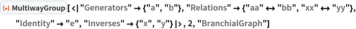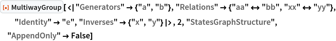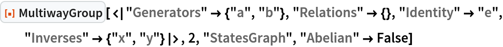 ResourceFunction["MultiwayGroup"][gen,rel,…] specifies the group with generators gen, relations rel, default identity element "e" and default inverse elements "1","2",…. | |