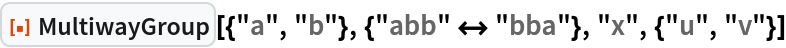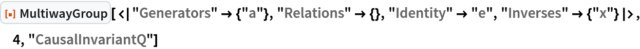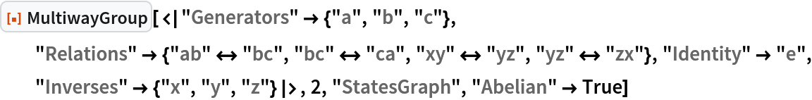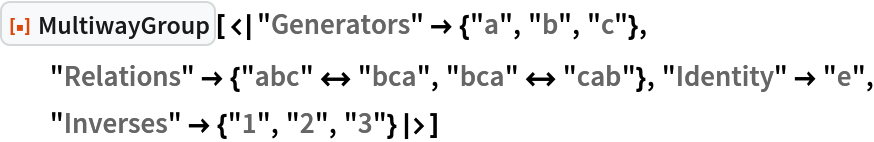 ResourceFunction["MultiwayGroup"][gen,rel,id,inv,…] specifies the group with generators gen, relations rel, identity element id and inverse elements inv. |