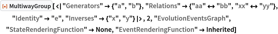 ResourceFunction["MultiwayGroup"][<|"Generators"→gen,"Relations"→rel,"Identity"→id,"Inverses"→inv|>] compiles the group with the specified generators, relations, identity element and inverse elements into a specification of a multiway system. | |