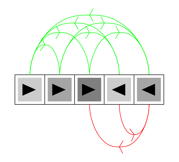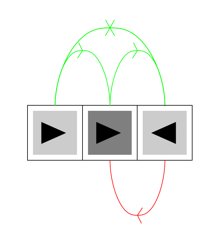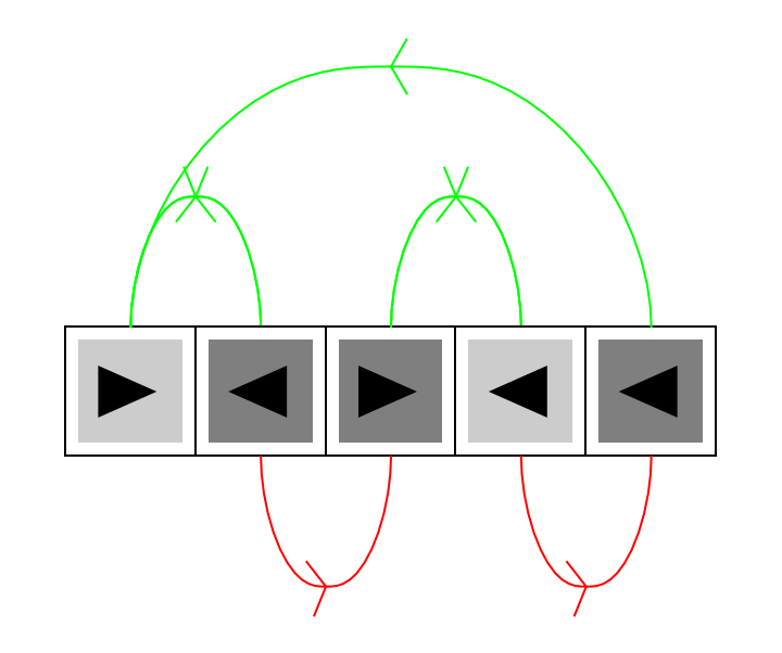 ResourceFunction["MultiwayRegisterMachine"]["RulePlot",prog,nreg] generates a visualization of a series of instructions, which forms a multiway register machine. Each instruction is represented as a color depicting its type, an arrow depecting an increment or decrement. There are directed edges depicted as arrows connecting various instructions. The edges above the instructions are green, used when it was a success, and the edges below the instruction are red, used when it was a failure.