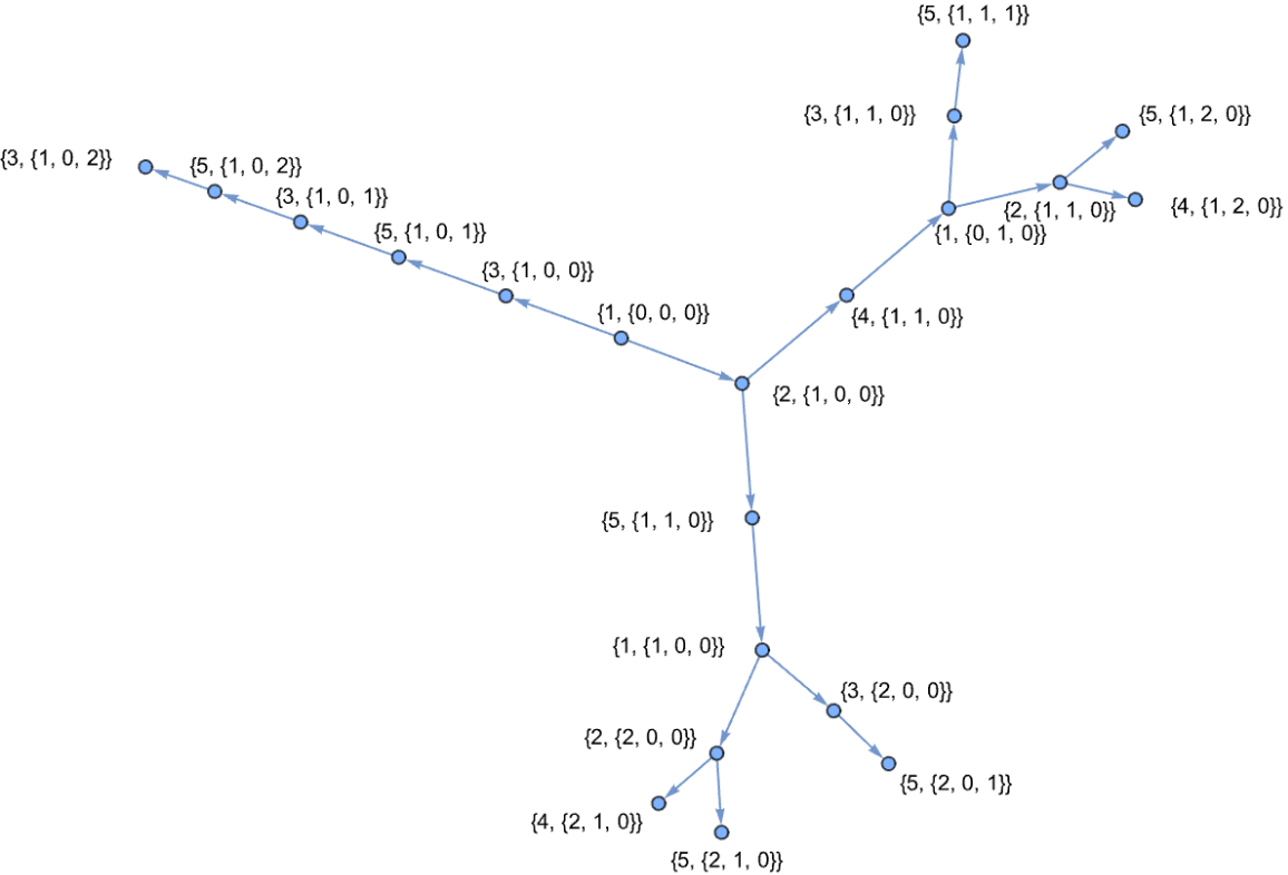 ResourceFunction["MultiwayRegisterMachine"]["EvolveGraph",prog,depth,init,show] is used to display the evolution of a multiway register machine through a graph with directed edges. Each possible branch represents a path that the register machine could have taken based on its options.