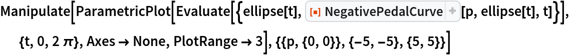 ResourceFunction["NegativePedalCurve"][{a,b},c,t] computes the negative pedal curve with respect to the point {a,b} of the curve c in parameter t. |