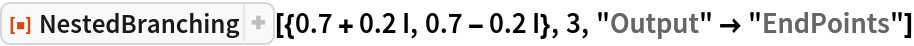 ResourceFunction["NestedBranching"][b,n] generates a branching model of depth n specified by the rule b, a list of complex numbers representing the result of the first step. |