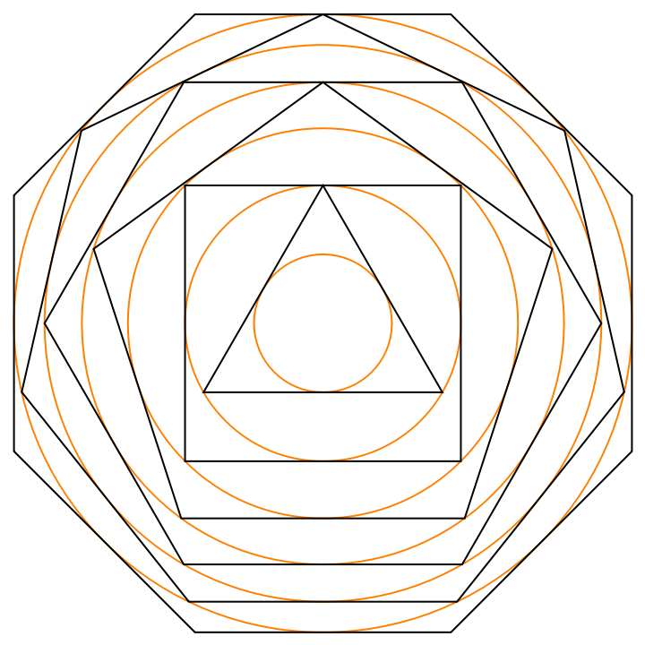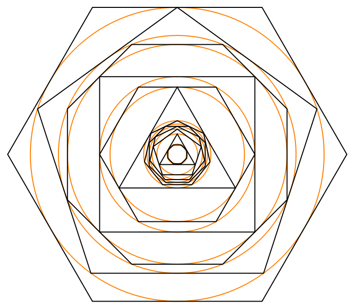Nest a sequence of regular n-gons, increasing n to create a two-dimensional Kepler model: