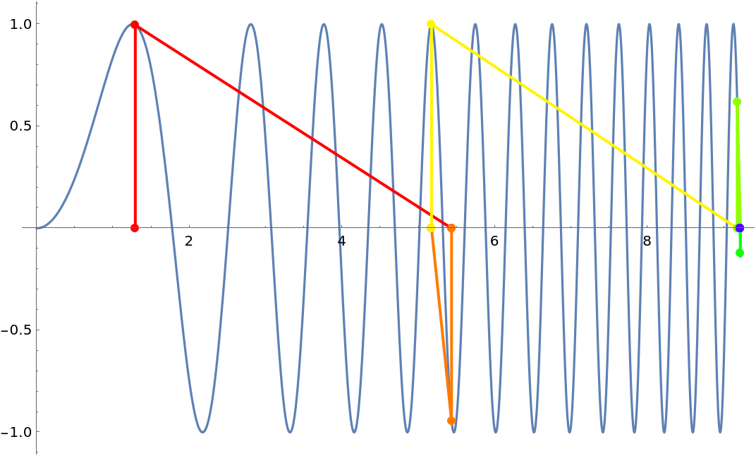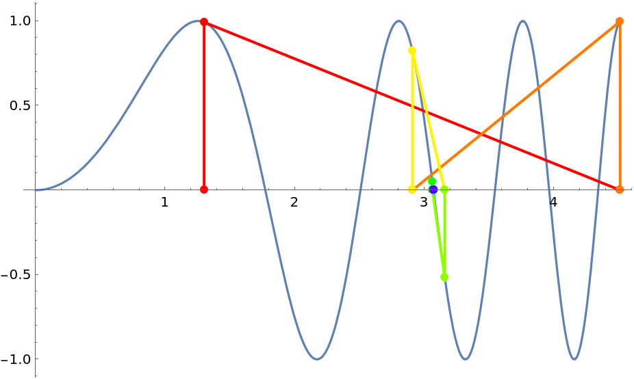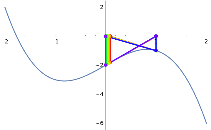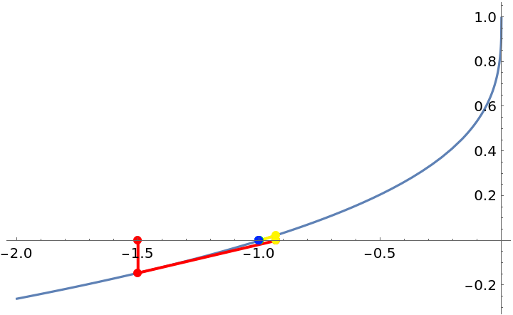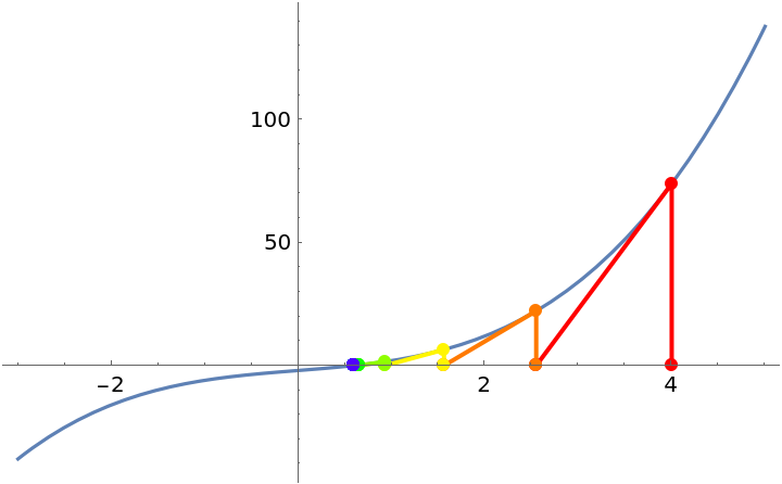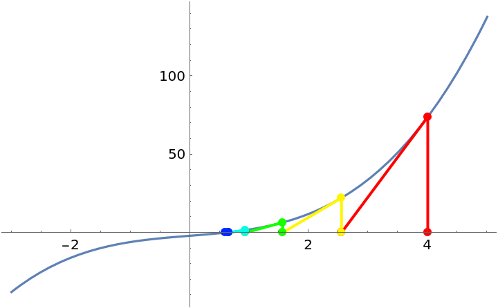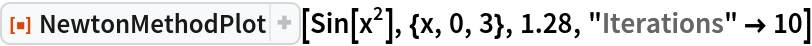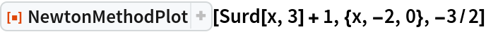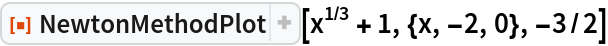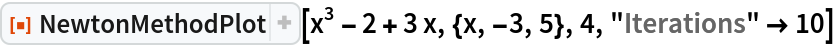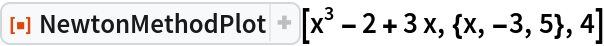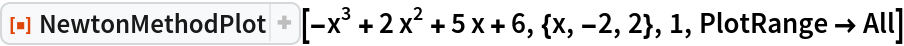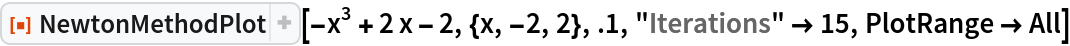 ResourceFunction["NewtonMethodPlot"][f,{x,xmin,xmax},pt] returns a plot of f from x=xmin to x=xmax, together with illustrations representing the iterations of Newton’s root-finding method, starting at x=pt. |