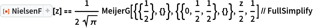 ResourceFunction["NielsenF"][z] gives the Nielsen function f(z). |
