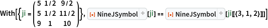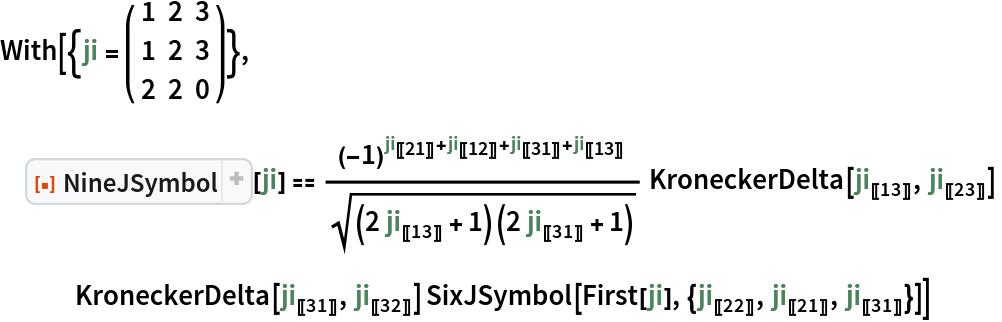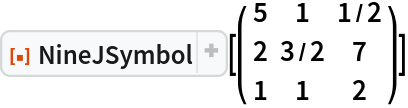 ResourceFunction["NineJSymbol"][{{j1,j2,j3},{j4,j5,j6},{j7,j8,j9}}] gives the values of the Wigner 9‐j symbol. |