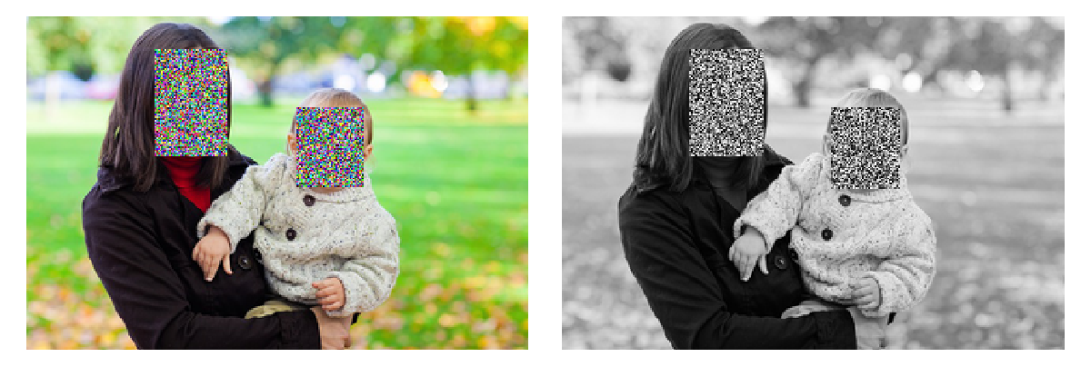 GraphicsRow@{ResourceFunction["OccludeFaces"][i, "Noise"], ResourceFunction["OccludeFaces"][ColorConvert[i, "GrayScale"], "Noise"]}