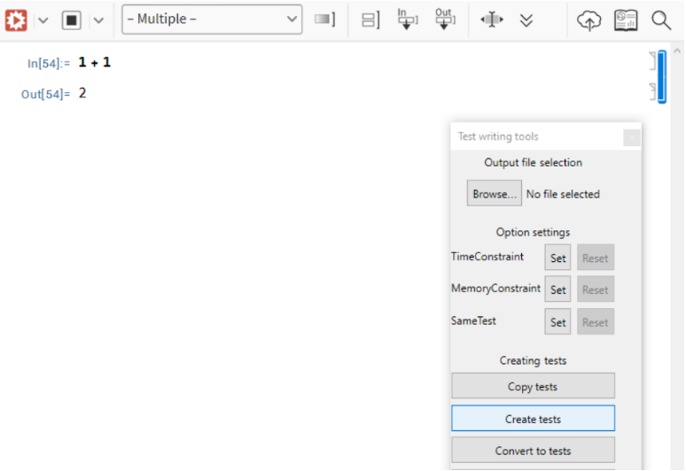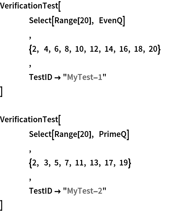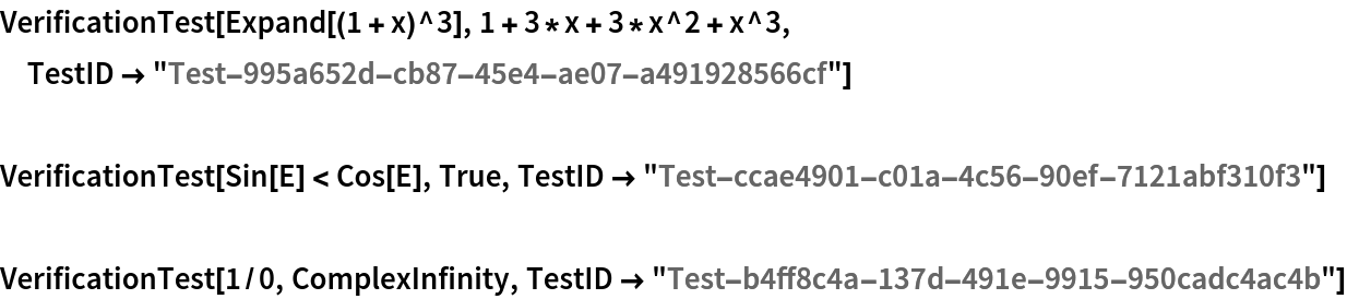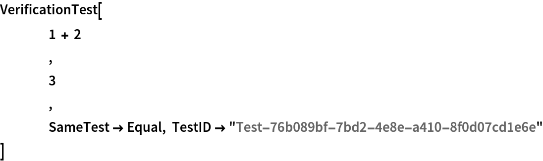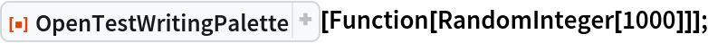 ResourceFunction["OpenTestWritingPalette"][] creates a palette with buttons that allow you to create VerificationTest expressions from pairs of input-output cells. | |
