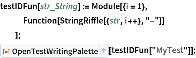 ResourceFunction["OpenTestWritingPalette"][fun] uses fun[] to create a TestID for each test that is created. | |
