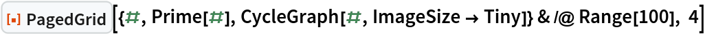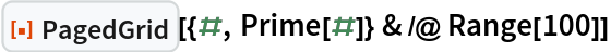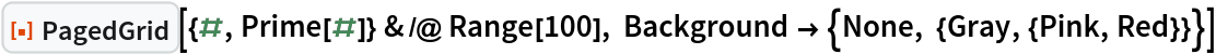 Make a paginated grid of the first 100 primes, using custom Background coloring: