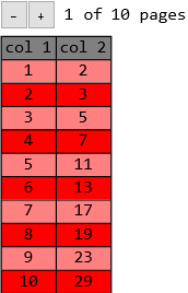 ResourceFunction["PagedGrid"][data] displays the 2d array data in a ten-row Grid, one page at a time, with buttons for moving between pages. | |