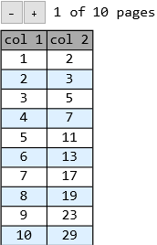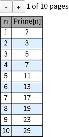 ResourceFunction["PagedGrid"][data] displays the 2d array data in a ten-row Grid, one page at a time, with buttons for moving between pages. | |