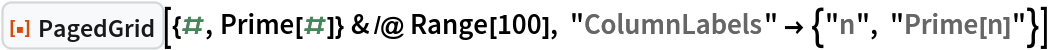 Make a paginated grid of the first 100 primes, using the option "ColumnLabels" to label the columns: