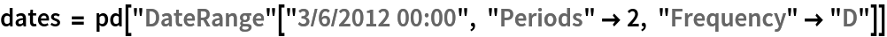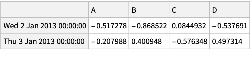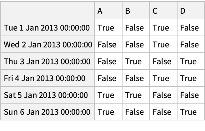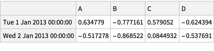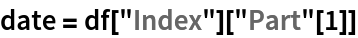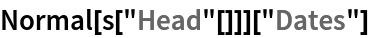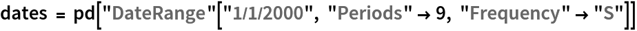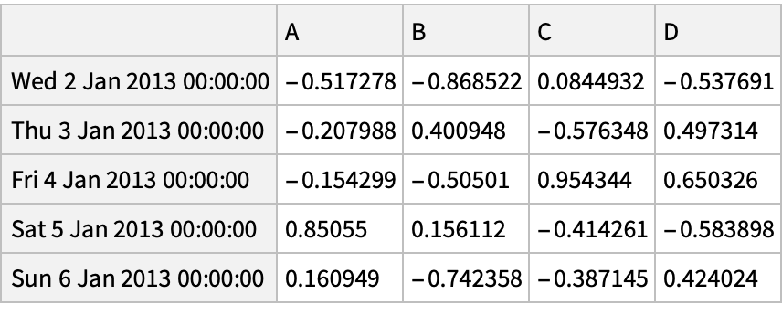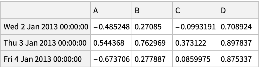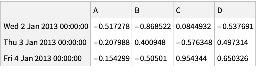 Construct a "DataFrame" object from the array of dates with labeled columns: