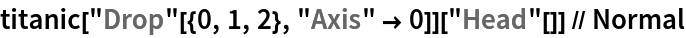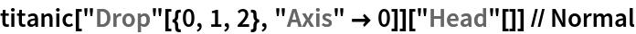 Drop the first few rows by giving the index values as labels and specifying "Axis"→0 for a row-wise operation: