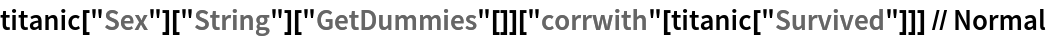 Find the correlation between the sex and survival by replacing string values in the "Sex" column with numbers using the String method "GetDummies" ("women first"):