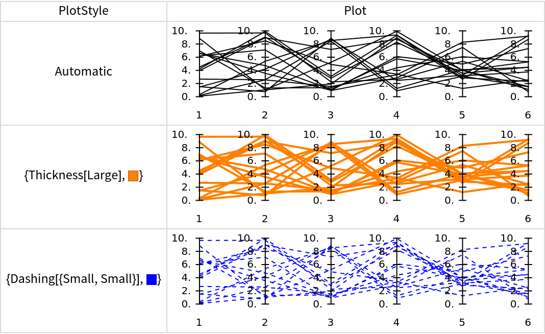 The option PlotStyle can be used to specify how the lines corresponding to the data elements are drawn: