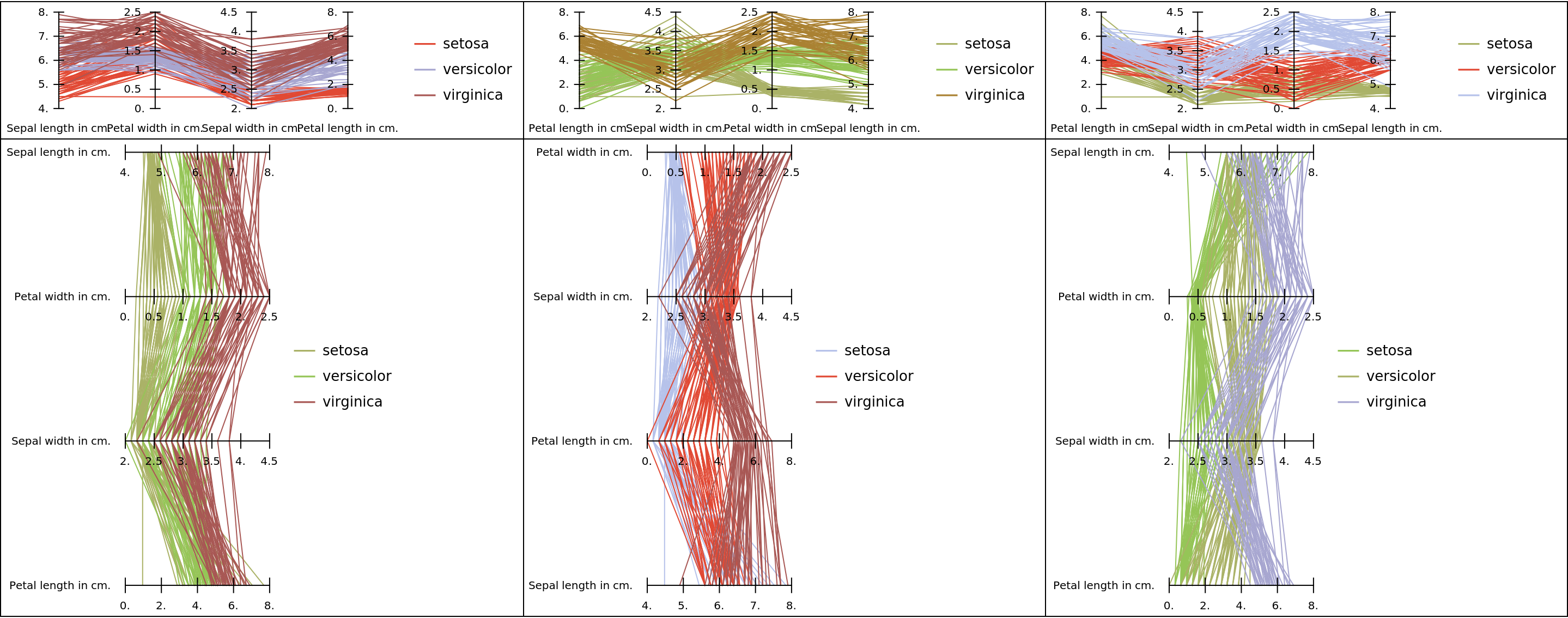 Here we visualize the multidimensional data of each matrix using a (combined) parallel coordinates plot: