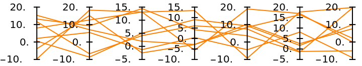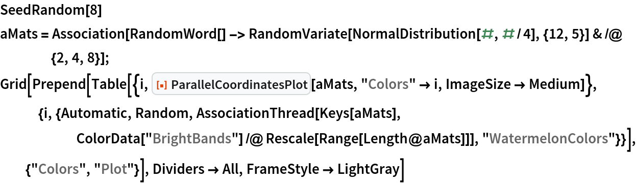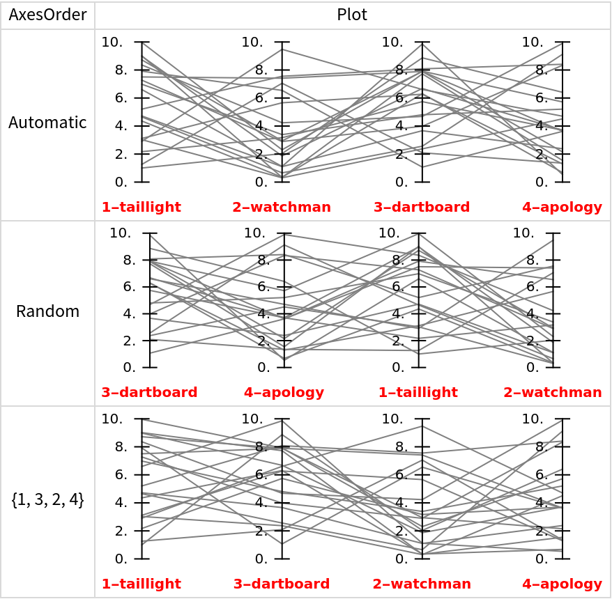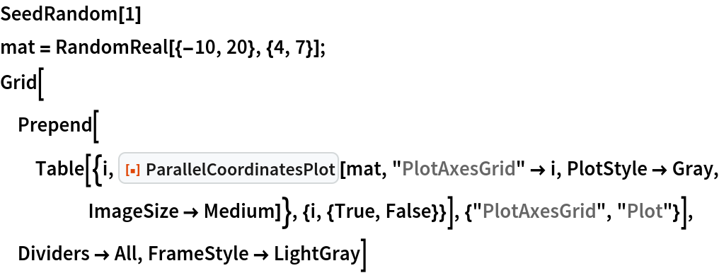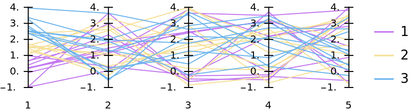 ResourceFunction["ParallelCoordinatesPlot"][mat] visualizes mat with a parallel coordinates plot. | |
