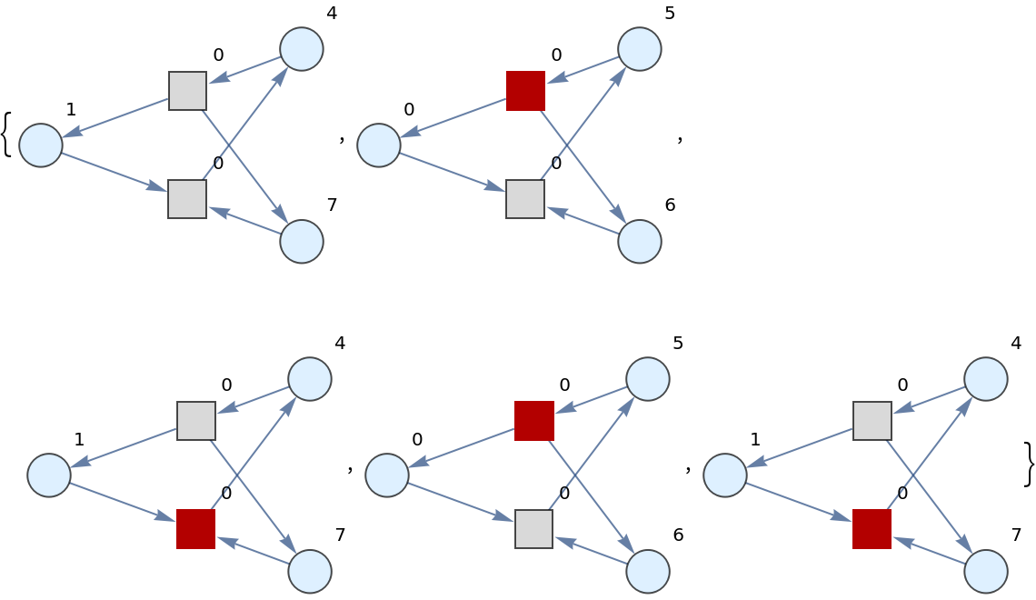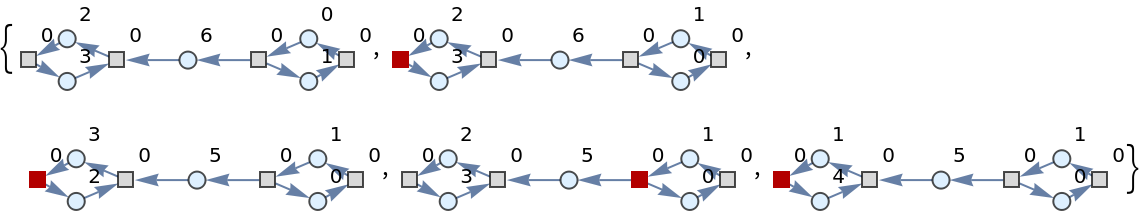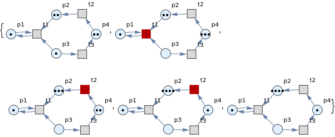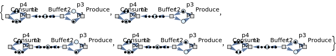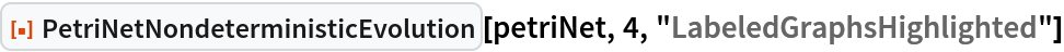 | "LabeledGraphsHighlighted" | list of directed graph representations obtained (with token counts represented graphically), and with transition firings highlighted |