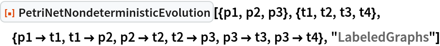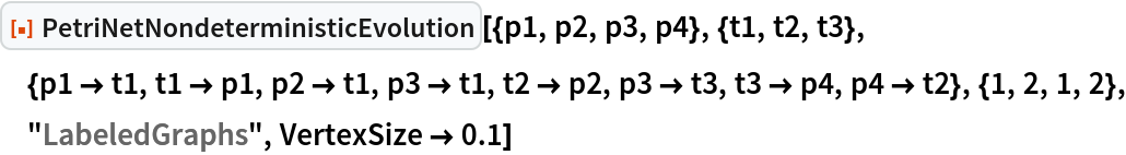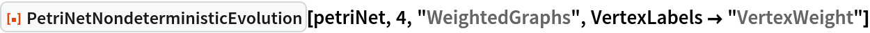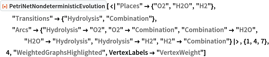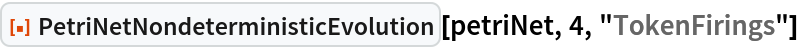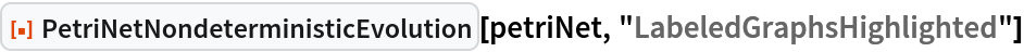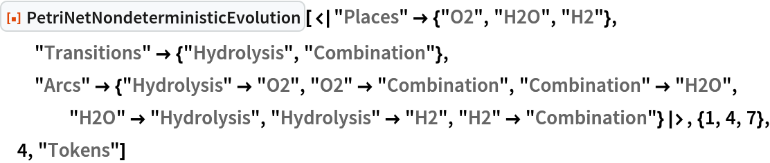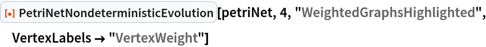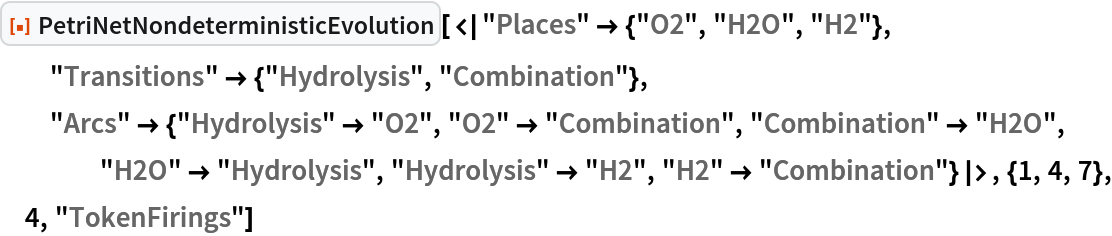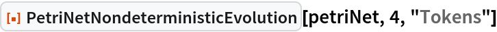 ResourceFunction["PetriNetNondeterministicEvolution"] evolves the specified Petri net nondeterministically by randomly selecting and applying one possible transition firing at each step.