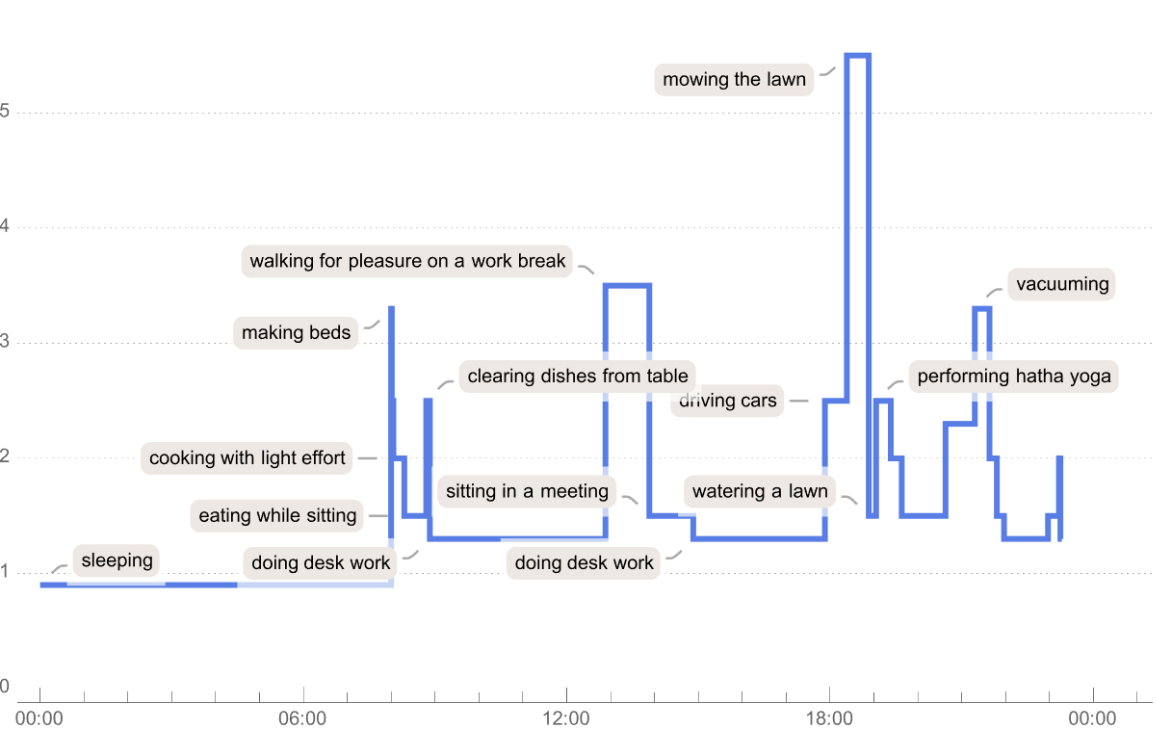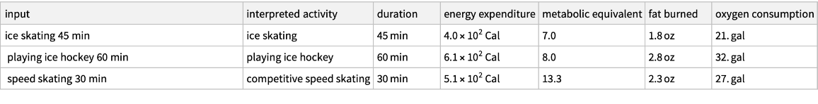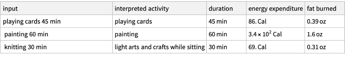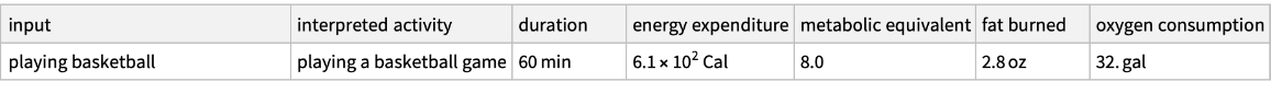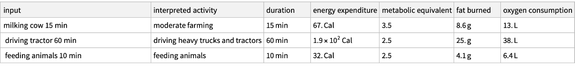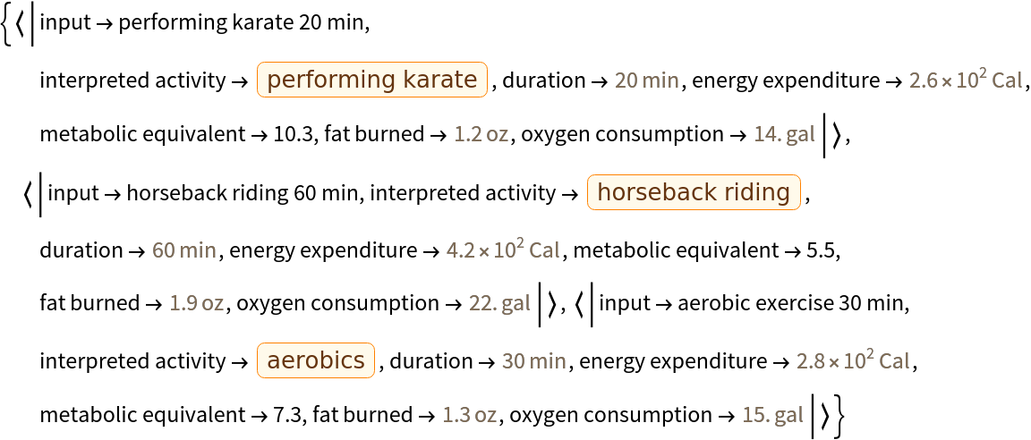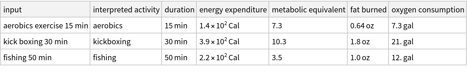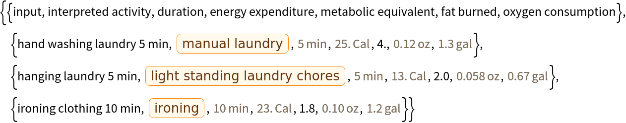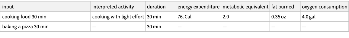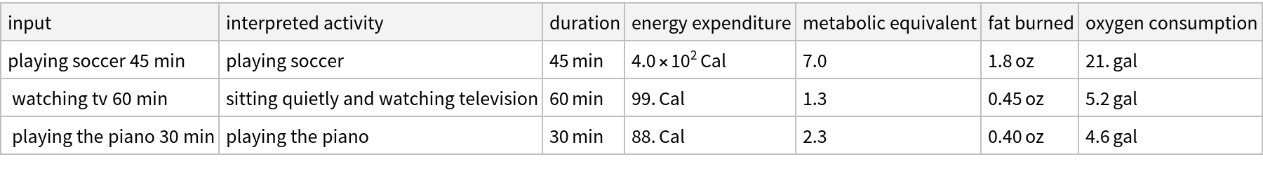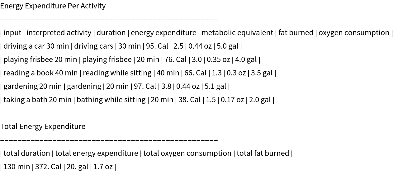 Get energy expenditure information about activities specified in lists of activities and duration: