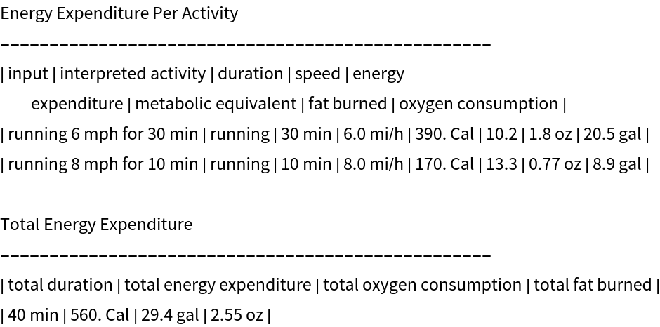 Get energy expenditure information as an ASCII table, with columns delimited by pipe characters ("|"):