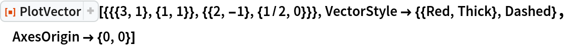 "PlotVector"][{{{3, 1}, {1, 1}}, {{2, -1}, {1/2, 0}}}, VectorStyle -> {{Red, Thick}, Dashed}, AxesOrigin -> {0, 0}]