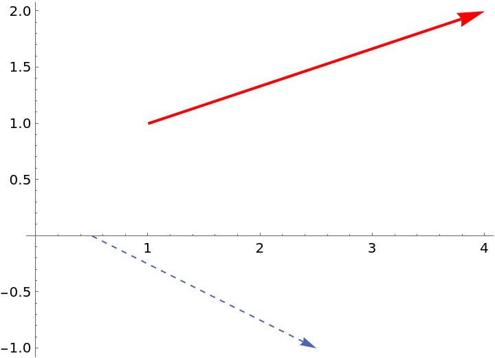 "PlotVector"][{{{3, 1}, {1, 1}}, {{2, -1}, {1/2, 0}}}, VectorStyle -> {{Red, Thick}, Dashed}, "ArrowSize" -> {Large, Medium}, AxesOrigin -> {0, 0}]