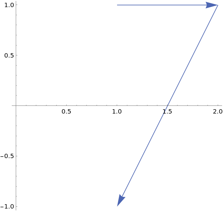 ResourceFunction["PlotVector"][{{{2, 1}, {1, -1}}, {{1, 1}, {2, 1}}}, "LocatedVector" -> False, AxesOrigin -> {0, 0}]