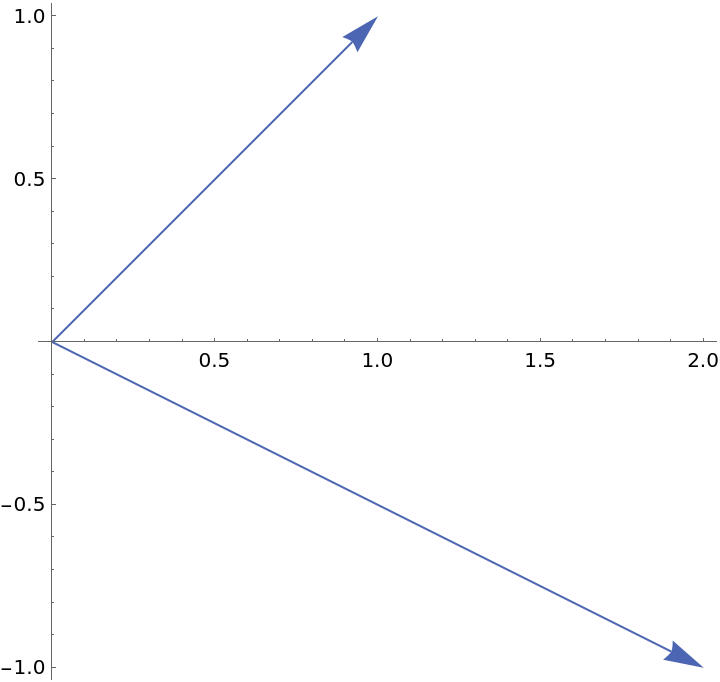 ResourceFunction["PlotVector"][{{1, 1}, {2, -1}}, "LocatedVector" -> False, AxesOrigin -> {0, 0}]