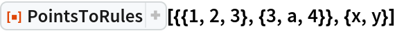 ResourceFunction["PointsToRules"][{{1, 2, 3}, {3, a, 4}}, {x, y}]