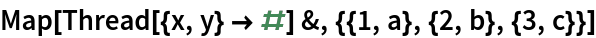 Map[Thread[{x, y} -> #] &, {{1, a}, {2, b}, {3, c}}]