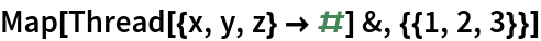 Map[Thread[{x, y, z} -> #] &, {{1, 2, 3}}]