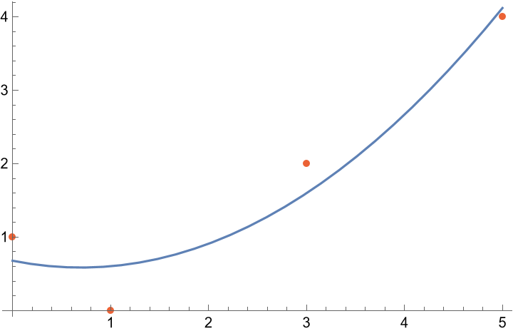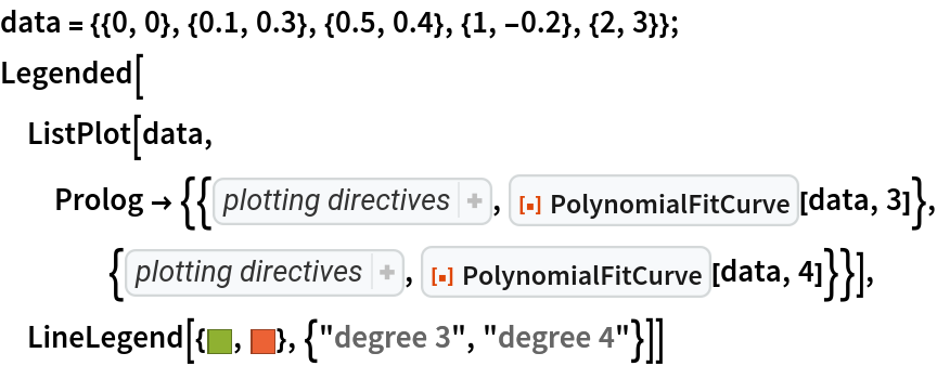 ResourceFunction["PolynomialFitCurve"][{{x1,y1},{x2,y2},…},n] returns a BSplineCurve representing the least-squares, degree-n polynomial fit of the points {xi,yi}. |