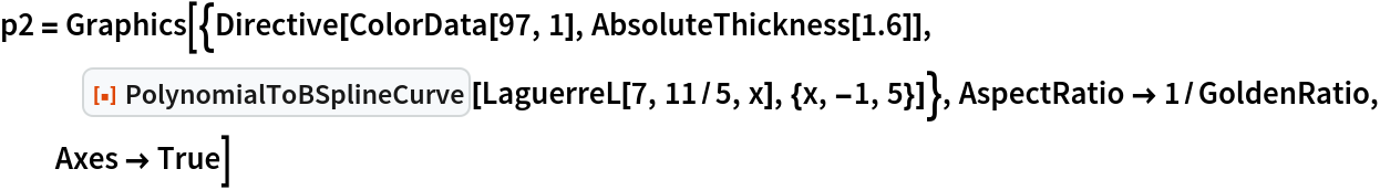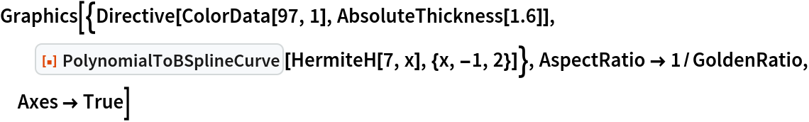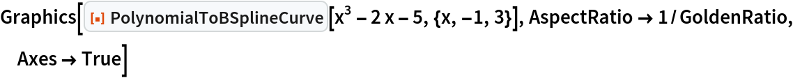 ResourceFunction["PolynomialToBSplineCurve"][p,{x,xmin,xmax}] generates a BSplineCurve representation of the polynomial p as a function of x from xmin to xmax. |