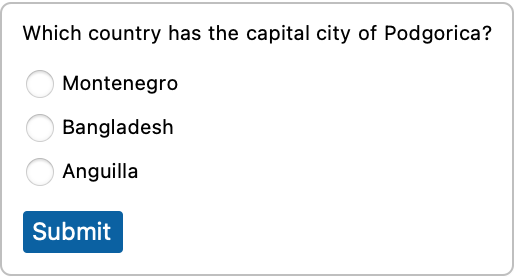 | "ChoiceCount" | 3 | the number of choices to offer as the answer to the question |