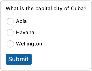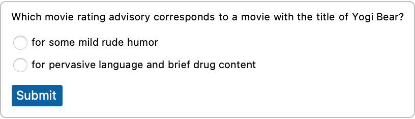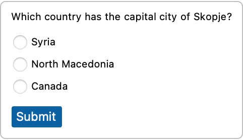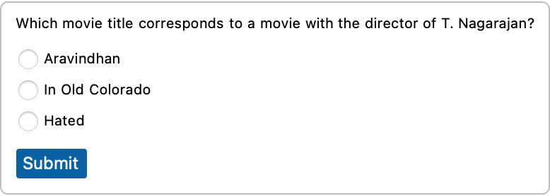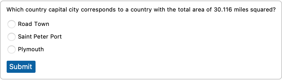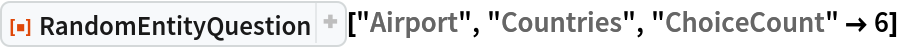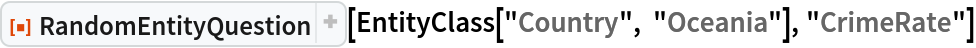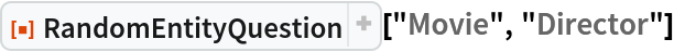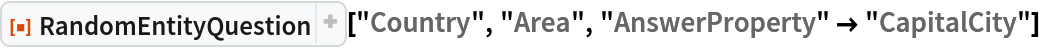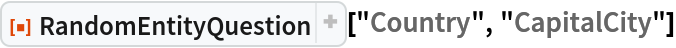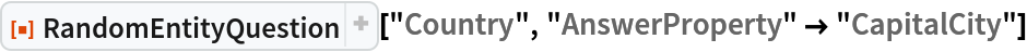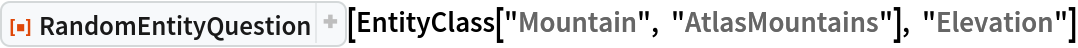 ResourceFunction["RandomEntityQuestion"][EntityProperty[type,prop]] generates a QuestionObject about a property prop of a random Entity of the specified type. |