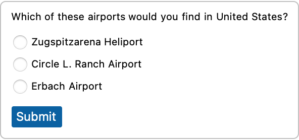 ResourceFunction["RandomEntityQuestion"][type] generates a QuestionObject about a random property of a random Entity of the specified type. | |