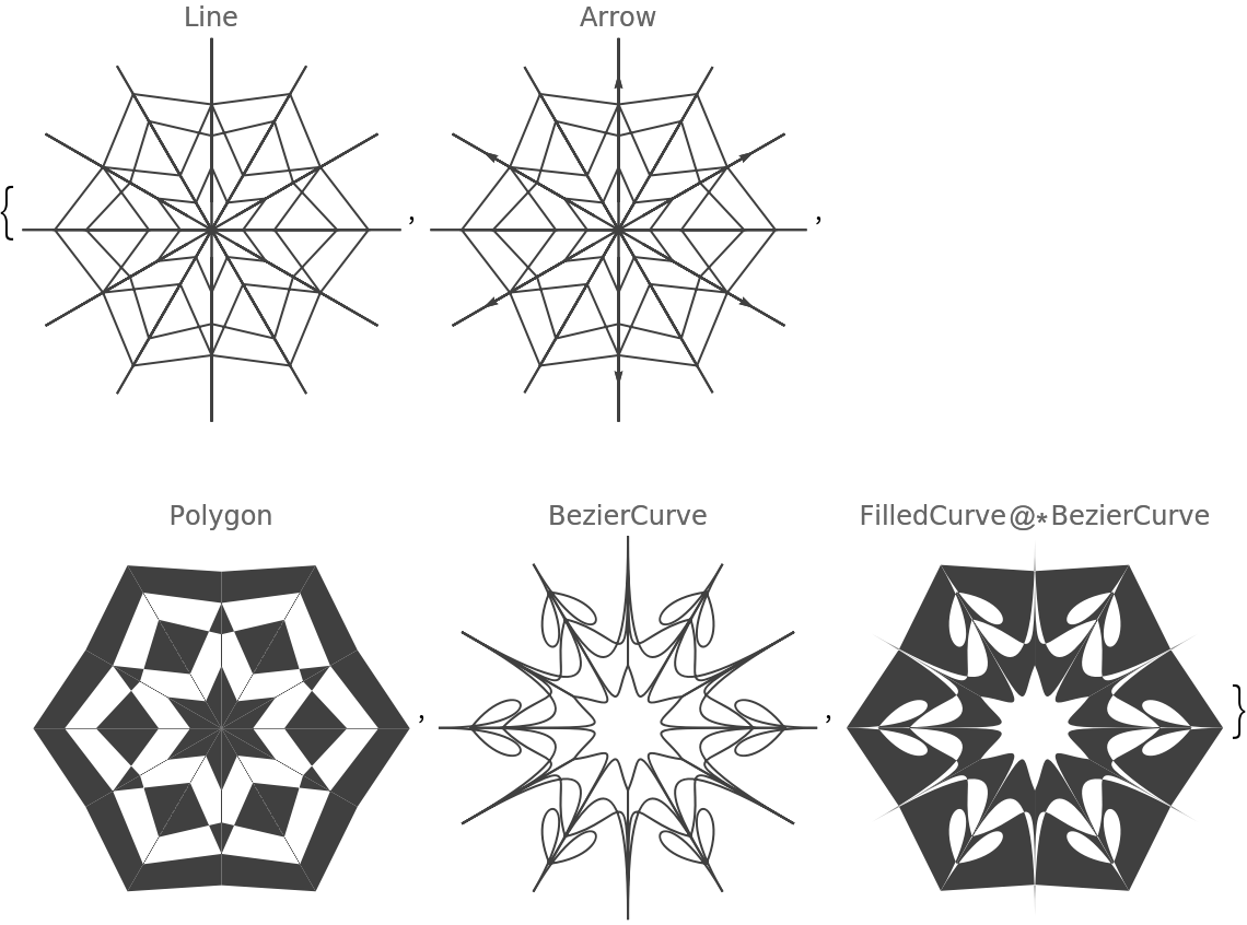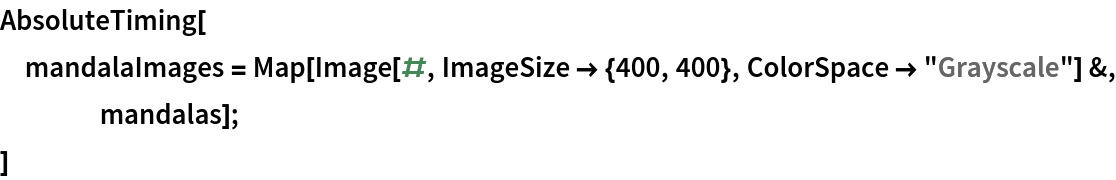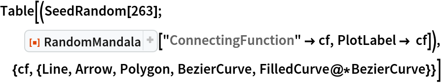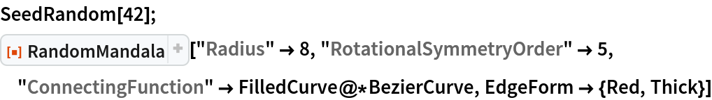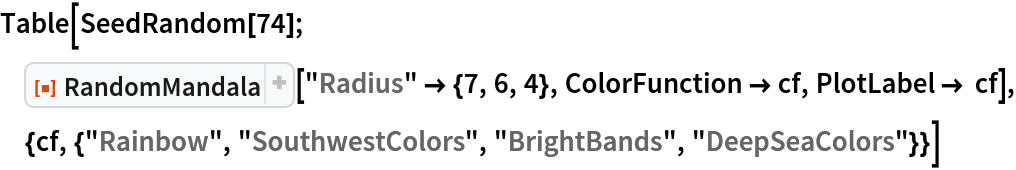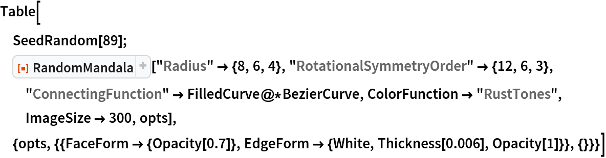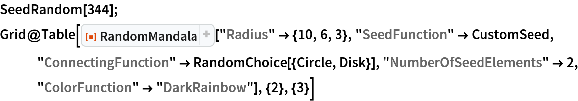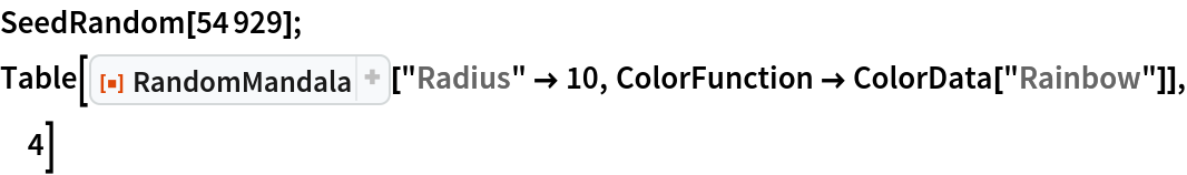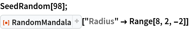 There are two modes of making random mandalas: (i) single-mandala mode and (ii) multi-mandala mode. The multi-mandala mode is activated by giving the "Radius" option a list of positive reals.