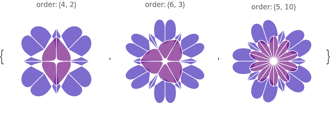 If both "Radius" and "RotationalSymmetryOrder" are given lists of numbers, then the corresponding elements in those are paired to make the specifications of the colorized mandalas: