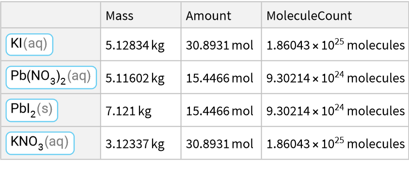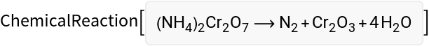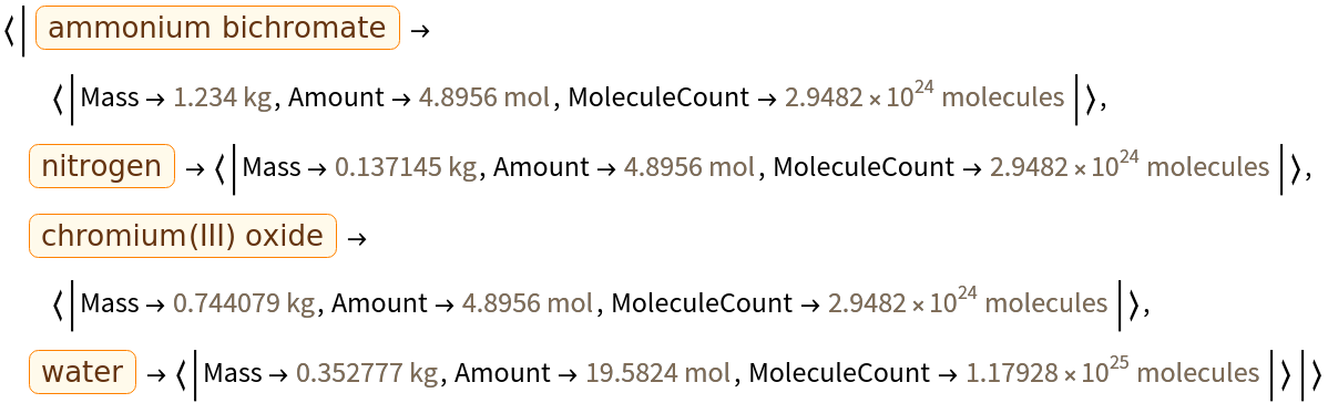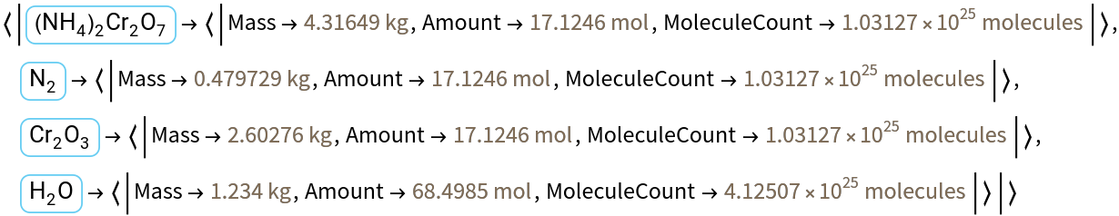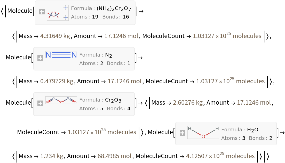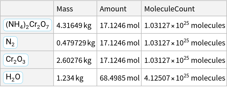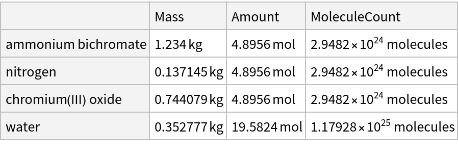 Summarize the products and reactants given 1.234 kg of ammonium bichromate: