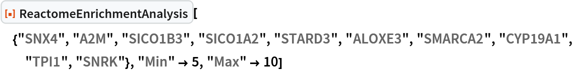 "ReactomeEnrichmentAnalysis"][{"SNX4", "A2M", "SICO1B3", "SICO1A2", "STARD3", "ALOXE3", "SMARCA2", "CYP19A1", "TPI1", "SNRK"}, "Min" -> 5, "Max" -> 10]