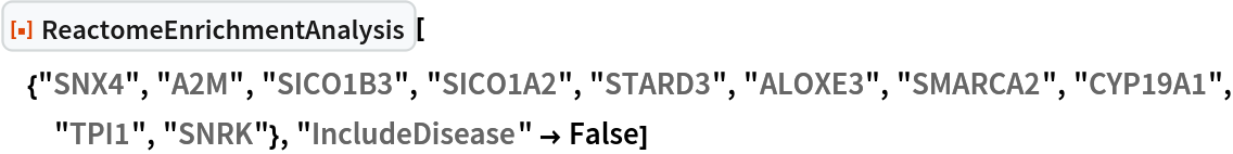 "ReactomeEnrichmentAnalysis"][{"SNX4", "A2M", "SICO1B3", "SICO1A2", "STARD3", "ALOXE3", "SMARCA2", "CYP19A1", "TPI1", "SNRK"}, "IncludeDisease" -> False]