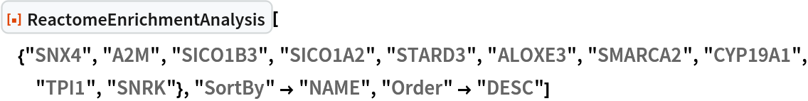 "ReactomeEnrichmentAnalysis"][{"SNX4", "A2M", "SICO1B3", "SICO1A2", "STARD3", "ALOXE3", "SMARCA2", "CYP19A1", "TPI1", "SNRK"}, "SortBy" -> "NAME", "Order" -> "DESC"]